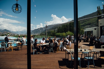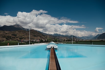Alle anzeigenIrgendwas fehlt. Irgendwas fehlt doch hier, und es ist nicht das Meer. Wer würde das schon erwarten, in Sion. Mein Blick geht hinauf zum schneebedeckten Mont Gond in den Berner Alpen, schweift über die A9, deren Rauschen sich mit entspannten Klängen von Boubacar Traoré vermischt, die aus den Lautsprechern auf der Panoramaterrasse dringen. Hängen bleibt er an einem keilförmigen Pool. Alaïa Bay wirkt, wie aus dem Tortendiagramm geschnitten.
