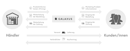 Der Kaufvertrag kommt unmittelbar zwischen Ihnen als Händler und dem Endkunden zustande. Eingegangene Kundenbestellungen werden Ihnen weitergeleitet, wonach Sie als Händler die bestellten Produkte direkt an die Kundschaft versenden. Galaxus fungiert im Rahmen des Händlerprogrammes als Vermittler. Wir verwalten Ihre Produktdaten, administrieren Ihre Bestellungen und übernehmen auch den gesamten Bezahlungsprozess.