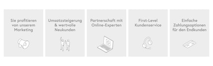 Aufgrund der Tatsache, dass Sie in unseren bestehenden Onlineshop voll integriert sind, auch wenn Sie klar als Händler mit Ihrem eigenen Namen und Brand ausgewiesen sind, werden Sie Teil von einem der spannendsten eCommerce-Projekte in Deutschland und profitieren von unserem enormen Wachstumspotential.