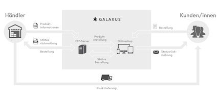 Im Rahmen der Teilautomatisierung exportieren Sie als Händler mindestens täglich Ihre aktuellen Produktdaten (Verkaufssortiment) aus einem Shop- oder ERP-System im csv.-Format auf einen FTP-Server von Galaxus. Damit halten Sie Ihr spezifisches Verkaufssortiment, sowie die entsprechenden Verkaufspreise und Lagerbestände auf unseren Onlineshops aktuell. Die Bestellungen rufen Sie demgegenüber im sogenannten Partner Portal von Galaxus manuell auf und können diese von dort aus ebenfalls manuell bearbeiten. Die sogenannten Statusrückmeldungen, wie «vorrätig» oder «verspätet», etc. und die Versandmeldung der Ware melden Sie uns manuell über das Partner Portal.