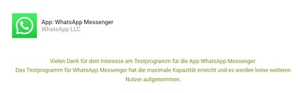 Alle anzeigenFalls du Hoffnungen hast, noch schnell zu den ausgewählten Beta-Tester*innen gehören zu können, muss ich dich auf eine Enttäuschung vorbereiten. Theoretisch genügt unter Android im Play Store ein Klick auf dieser Webseite, um sich für die Beta-Version von WhatsApp anzumelden. Allerdings ist die Kapazität momentan erschöpft und WhatsApp nimmt keine neuen Accounts ins Testprogramm auf.