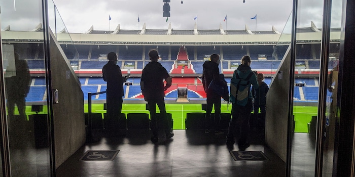 Ich stehe vor einem SUP mit PSG-Logo, über mir flackert Kylian Mbappé über den Videowürfel, darunter glitzern die Augen. Der Nachwuchs hat sich schon einen Trikotsatz in seiner Grösse gekrallt. Es ist der letzte, der Laden ist voll und eine Mutter erkundigt sich, ob wir es wirklich kaufen werden oder abgeben können. Begleitet von wütendem Geschrei geben wir die heisse Ware wieder frei. Denn wir sind nicht hier, um ein Kindertrikot für 50 Euro zu kaufen. In den Fanshop treibt uns nur der Regen. Wir sind hier, um ein leeres Stadion zu sehen. Für 80 Euro.