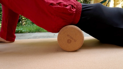 Das sagt Pascal dazu: «Der Korkball ist sehr gut, um punktuelle Verspannungen im Körper zu lösen. Positiv an diesem Ball ist, dass er sich nicht so leicht eindrücken lässt und dadurch gestaute Energie gelöst werden kann.» Für Daniela ist das Material hier ein grosser Pluspunkt. Verglichen mit anderen Massagebällen ist Kork angenehm, nicht zu hart, nicht zu weich.