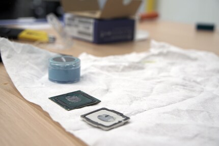 Die Wärmeleitpaste zwischen CPU und Kühler wird ausgetauschtDie Wärmeleitpaste wird in Handarbeit ersetzt. Vorsichtig wird die neue, leuchtend blaue Paste aufgetragen und der Prozessor wieder zusammengesetzt. Danach der Einbau.