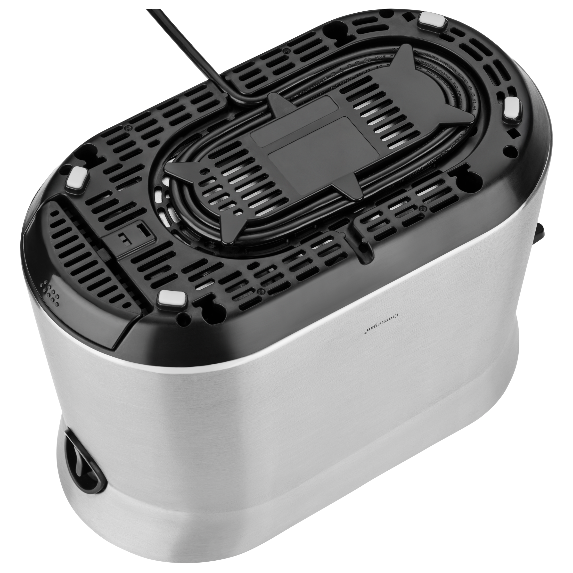 Modernes Design und hochwertige Materialien vereinen sich im WMF Kineo Toaster mit perfekten Toastergebnissen und komfortabler Bedienung. Sein ikonisches Design orientiert sich an klassischer skandinavischer Linienführung, mit schrägen Winkeln und kinetischen Formen. Die zeitlose Schönheit des 2-Schlitz-Toasters wird dabei durch das Gehäuse aus edlem Cromargan® perfekt in Szene gesetzt. Genauso weiss der Kineo Toaster auch mit perfekten Ergebnissen in 10 Bräunungsstufen für jeden Geschmack zu beeindrucken - jeweils intelligent angekündigt durch eine praktische Countdown-Funktion, die präzise die verbleibende Zeit bis zum fertigen Gaumenschmaus anzeigt. Ein LED-Display mit Touch-Control, der integrierte Brötchenaufsatz sowie die entnehmbare Krümelschublade sorgen darüber hinaus für ein komfortables Handling, vielseitige Anwendungen und eine einfache Reinigung.
