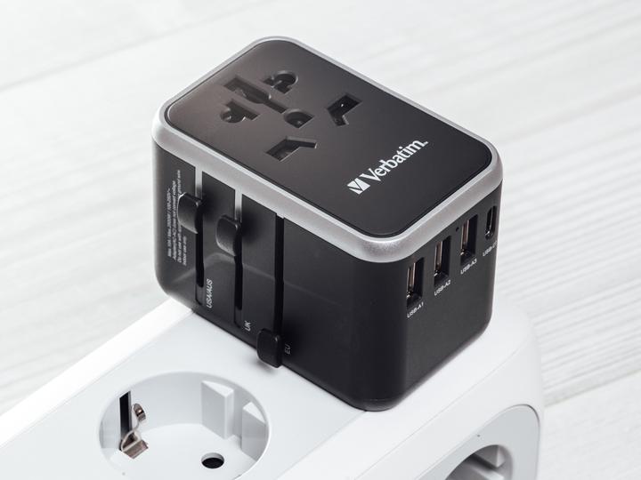 Weltweit einsetzbarer Universal-Reiseadapter: in über 180 Ländern verwendbar. Unterstützt den Anschluss von bis zu 6 Geräten gleichzeitig. Eingangsspannung: 100 - 250 Volt AC. Nennleistung: max. 10 A / 2.500 Watt. Kompatible Steckdosen: Typ A/B/C/D/E/F/G/H/I/J/K/L/M/N/O. Kompatible Stecker: Typ A/B/C/E/F/G/I/J/L/N. 1x USB-C mit Power Delivery bis 61 Watt: zum schnellen Aufladen von kompatiblen Mobilgeräten mit USB-C-Ladeanschluss. USB-C-Ladestrom mit automatischer Anpassung: 5 Volt bis 3 A / 15 Watt, 9 Volt bis 3 A / 27 Watt, 12 Volt bis 3 A / 36 Watt, 20,3 Volt bis 3 A / 61 Watt. 1x Standard-USB-C: 5 Volt bis 2,4 A / 12 Watt. 3x USB-A: 5 Volt bis 2,4 A / 12 Watt (je Port und gesamt). Gehäuse aus hochwertigem, feuerbeständigem Polycarbonat. Mit Sicherheitsabdeckung ausgestattet. Farbe: schwarz. Masse: 75 x 50 x 54 mm, Gewicht: 180 g. Reiseadapter inklusive Anleitung.