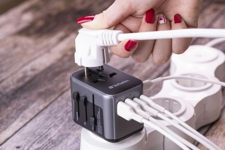 Der Verbatim Universal-Reiseadapter kann in über 180 Ländern verwendet werden. Dank des World-to-World Mehrfachsteckers können Laptops oder akkubetriebene Geräte überall auf der Welt mit dem Stromnetz verbunden und wieder aufgeladen werden. Der USB Typ-C Anschluss unterstützt Power Delivery (PD), der USB Typ-A Anschluss Quick Charge 3.0 für schnelles Aufladen. Der kompakte und leistungsstarke Universal-Reiseadapter ermöglicht die gleichzeitige Nutzung der Wechselstromsteckdose und der USB-Anschlüsse. Die Eingangsspannung des Mehrfachsteckers beträgt 100-250V. Er kann so weltweit zum Laden mehrerer Geräte verwendet werden. Die drei gängigsten internationalen Stecker (Euro, UK, US) kommen durch Schieben der Regler zum Vorschein und die Stecker für Australien oder China stehen durch einfaches Herumdrehen der Pole zur Verfügung. Der Universal-Adapter aus hochwertigem, feuerbeständigem Polycarbonat ist zudem mit Sicherheitsabdeckungen zur Kindersicherung ausgestattet.