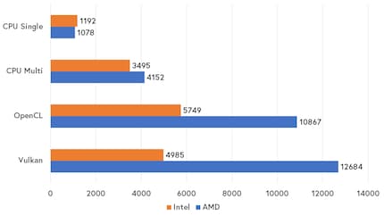 The differences in performance are even clearer with the graphics chips. The AMD graphics chip dominates the Intel GPU with both OpenCL - 10,867 versus 5749 points - and Vulkan - 12,684 versus 4985 points.