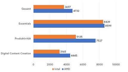 PCMark tests the notebooks with a wide range of tasks. The overall result and three partial results are given at the end. The "Essentials" include things like launching applications, video calls and web browsing. In the "Productivity" section, the tool tests spreadsheets and text writing, among other things. The "Digital Content Creation" section includes photo and video editing and rendering, for example.