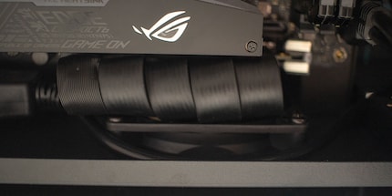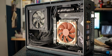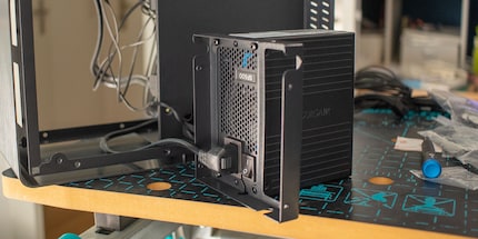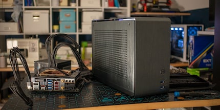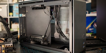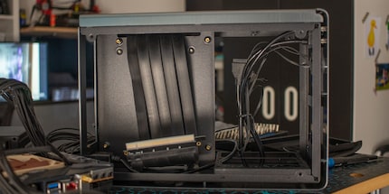 I attach the power supply unit to the top front with a bracket. This makes the PSU's power switch difficult to access inside the housing. So I have to remember to press it before screwing the housing shut. To ensure that the power connection is still at the back, Kolink runs a power cable through the case to the rear. Two 2.5-inch drives can be mounted on another bracket underneath the power supply unit.