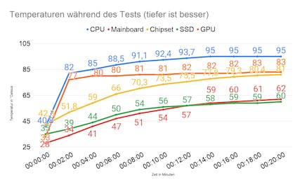 Compared to the Osmi 3.1, the chipset and the mainboard in the Rocket are hotter. At a maximum of 81° Celsius, the chipset in the Rocket runs 7° Celsius warmer than in the Osmi. The difference for the mainboard is also 7° Celsius: 62° compared to 55° Celsius. The SSD, on the other hand, remains two degrees cooler in the Rocket at 60° Celsius.