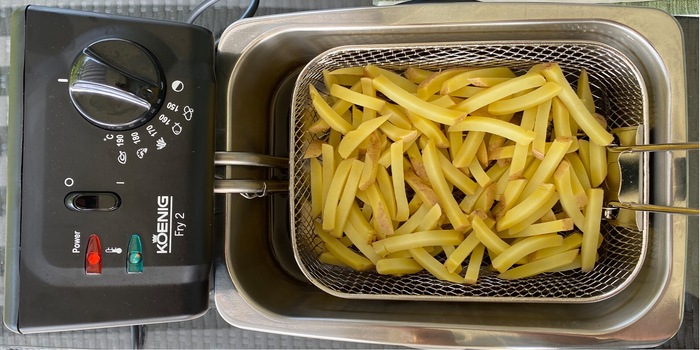 Enough of the many words, let the deeds follow. I cut the potatoes into thin sticks. In the meantime, I've really come to love the chip cutter because it takes the tedious work out of my hands with just one movement. Now I cook the sticks in a saucepan filled with just under two litres of water and two tablespoons of table vinegar. The recipes and comments talk about ten minutes. I choose eight minutes because my sticks are thinner than in most instructions. If I cook the potato sticks too long and they fall apart, the fries would be ruined. I then dry the fries, deep-fry them for three minutes at 150 degrees Celsius and leave them to drain and cool on a wire rack lined with kitchen paper. Six hours later, I toss them into the deep-frying oil at 180 degrees Celsius for a further four minutes to finish off the delicacy. Just before the kitchen alarm clock rings, I ask myself: was all the effort really worth it?