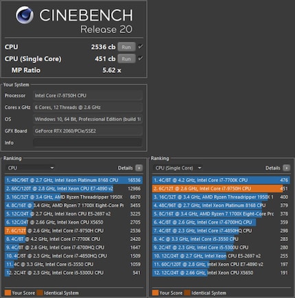 With Cinebench from Maxon, you can test how your PC performs when rendering Cinema 4D content. Processors with more cores will always deliver a better result here (except for single-core results). If you want to compare processors with Cinebench, this is only possible if both processors have the same number of threads.