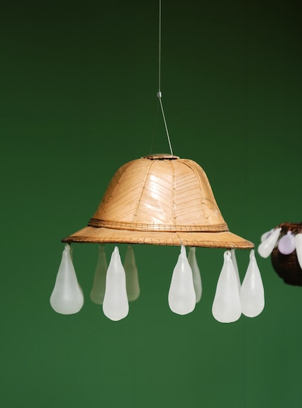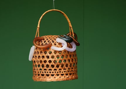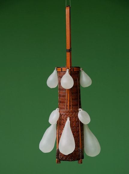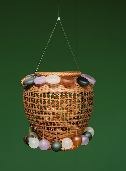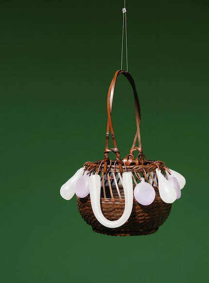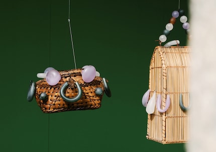 In her basket series «Hybrid Exhalations», artist Dima Srouji uses bamboo as a symbol of exchange and togetherness. The bamboo canes form a network that visualises air currents and represents breath as the source of life. With light, hand-blown glass objects, Dima creates delicate works that combine grass and glass in an impressive way.