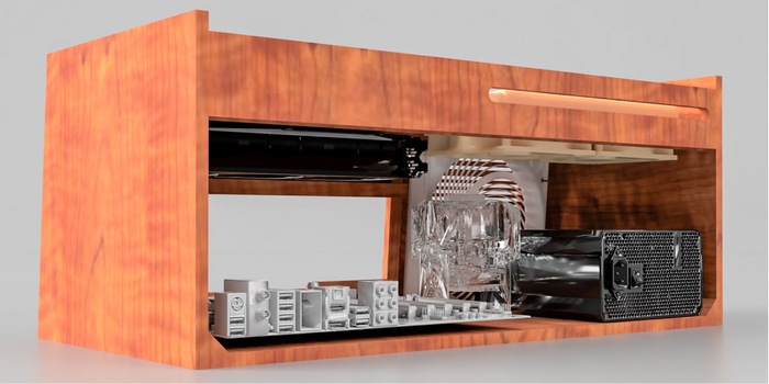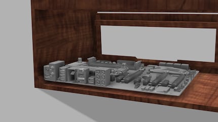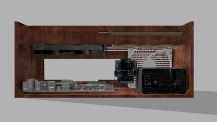 After the case has been reconstructed, I place the components virtually. These are 3D models that I find online. Not all parts are the ones I actually install. The graphics card in the rendering is a Radeon VII and the pump with reservoir is from Alphacool. I don't yet know which graphics card will actually be installed. The Radeon VII seems to me to be a good placeholder in terms of size. The pump will be a Magicool DCP 450, which I will modify a little with 3D printing to make it look like an electron tube. This way, the inside will also be reminiscent of the history of the housing.
