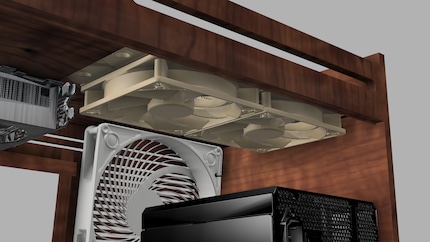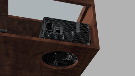 I've made sure that hot air is dissipated. Now I need to find a way to transport fresh air into the housing. The old positioning of the speaker is ideal for this. In future, air should flow in where sound used to flow out. A 180 millimetre fan fits perfectly there.