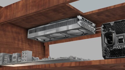 I came up with something special for the graphics card: I salvaged a bracket from my colleague Philipp Rüegg's old streaming PC. This allows the graphics card to be mounted in any conceivable place. In this case, I opted for the ceiling. No matter which graphics card goes in, it has to be one with proper RGB at the front by the fans. This way, I illuminate the entire installation from above.