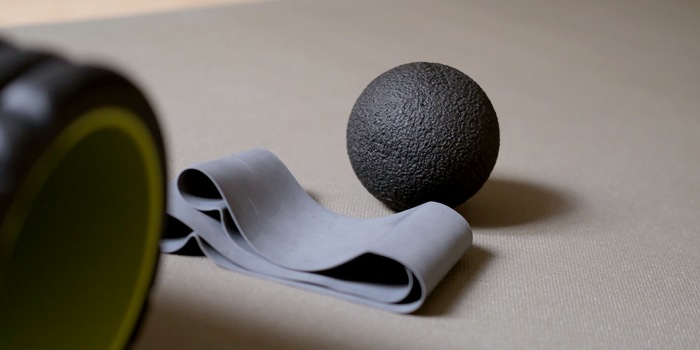 To strengthen the muscles and ligaments in my feet, I do balance exercises. For one of them, I use a loop band, a ball cushion or a conventional cushion and a yoga mat, which are colour-coordinated. They have restrained grey and blue tones.