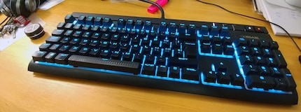 Interesting note: The base colour of the keyboard lighting is apparently stored somewhere in the keyboard itself, but the effects are not. If you want the effects, then the Corsair Utility Engine must be running in the background. In other words: Blue illumination works. Red when I press the key does not.