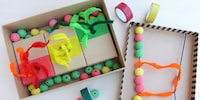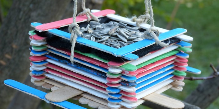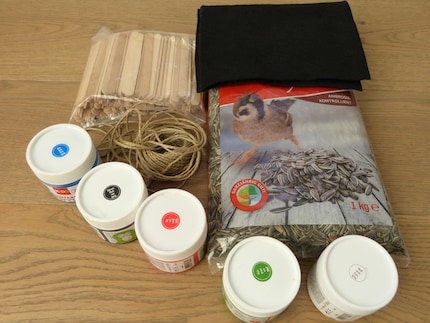 For the colourful bird feeder, you will need lots of popsicle sticks, finger paints for painting (alternatively acrylic paint), a hot glue gun, string, a piece of felt and birdseed (sunflower seeds or similar). You can use brushes, a glass of water, scissors and possibly a painting apron for the children.