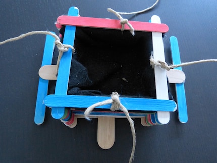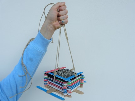 To hang up the bird feeder, thread the string through between the top and second-top popsicle sticks on all four sides. Then fill it with bird food and put it in the garden.