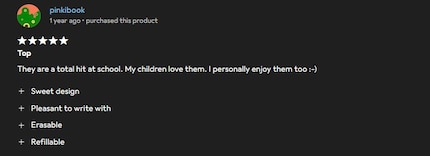 Show allI totally get why children love Legami’s products so much. They’re really cute, especially the gel pens. But do they have anything to offer beyond their appearance? Well, you can write with them and rub out what you’ve written which (schools aren’t particularly fond of) (article in German). This is made possible by the ball at the other end of the pens, with which you can easily remove the heat-sensitive ink.