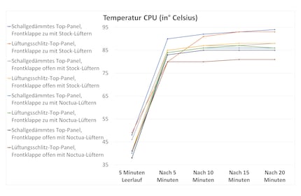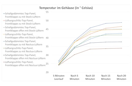 The results are as I expected. The more inlet and outlet openings the housing has, the better fresh air is transported in and out. The temperatures are always lower with the Noctua fans. In the case, the temperature difference between the worst configuration (sound-insulated top panel, front flap closed with stock fans) and the best configuration (ventilation slot top panel, front flap open with Noctua fans) is 14.9° Celsius. The difference in noise emission is 5 dB. 46 dB with the configuration "Sound-insulated top panel, front flap closed with stock fans" and 51 dB with the configuration "Ventilation slot top panel, front flap open with Noctua fans".