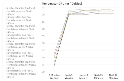 Temperatures | Sound-insulated top panel, front flap closed with stock fans | Ventilation slot top panel, front flap closed with stock fans | Sound-insulated top panel, front flap open with stock fans | Ventilation slot top panel, front flap open with stock fans | Sound-insulated top panel, front flap closed with Noctua fans | Ventilation slot top panel, front flap closed with Noctua fans | Sound-insulated top panel, front flap open with Noctua fans | Ventilation slot top panel, front flap open with Noctua fans |