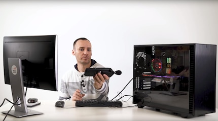 I run the stress tests for 20 minutes. I measure the temperature with three thermometers at different points: One thermometer measures the ambient temperature. For better comparability, I do the tests in our studio in the basement. The temperature there averages 20° Celsius throughout the year. I place another thermometer in the centre of the case in front of the graphics card. I attach the last thermometer with adhesive tape behind the fan at the end of the case. I use three case fans: two at the front and one at the back. I set them to 100 per cent power in the BIOS.