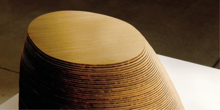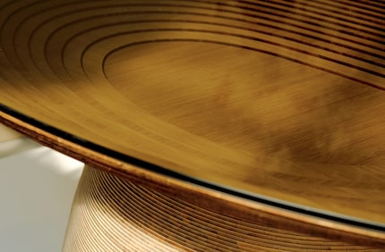 The tables in the Stratum series rise layer by layer from a veneer panel made from fast-growing bamboo. Like a timeline. It’s made by hand: «Every smaller part comes from a larger one, so every centimetre of the surface is used,» Daan explains. Using lasercutting, he cuts the 5 millimetre thin veneer into pieces and then reassembles them until they form a conical object – like an ice cream cone, just not quite as pointed.