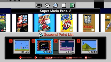 Press the reset button to return from the game to the overview menu. If you then press the up button on the D-pad, your progress will be saved. Gone are the days when you had to leave the console switched on for days to avoid having to start all over again. There are four save slots per game to choose from. However, you can also use the original save functions.