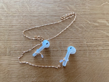 here. Rummaging through my things, I come across a glasses chain that I had previously spurned. Will it work with wireless headphones? I pull my earbud through the loop of the glasses chain and tighten the elastic. Now I give the chain a jerky shake to check whether the earpiece is actually holding. And it does. The chain also passes the practical test. For the first time, I do my commissions without a headset-induced panic attack. Shopping hasn't been this stress-free for a long time - if I hadn't had to frantically search for my keys outside the front door. [[image:34122399]]