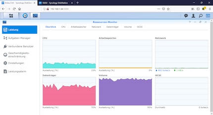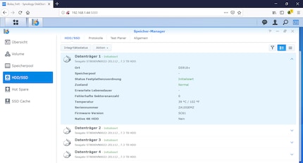 Before we start, I take a look at the state of the hard drives - everything seems to be in order. The temperature is 39°C. Exactly the same temperature as the WD-Red hard drives in the DS212+ with the fan in "silent mode".
