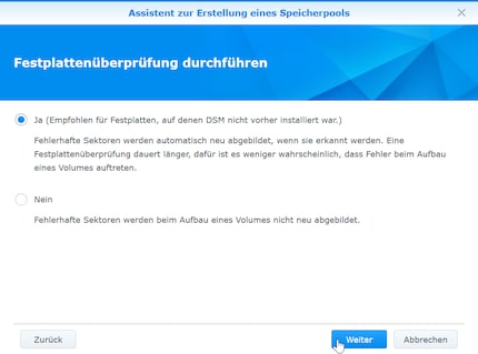 It doesn't really matter, as I have no intention of creating or using more than one volume. Incidentally, I'm also reluctant to use SHR (Synology Hybrid RAID). So I tick "best performance" and click "next".