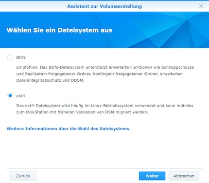 Although Synology recommends using Btrfs, I choose ext4. Not only because of the speed, but also because, in an emergency, ext4 allows me to read the contents of a hard drive from an external enclosure relatively easily