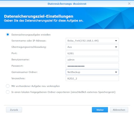 The target NAS settings are quickly defined. When I click on the server name, the system automatically suggests Boba_Fett. The port is predefined - only the username and password need to be entered. You also need to select the shared folder and target directory or accept the automatic suggestion.