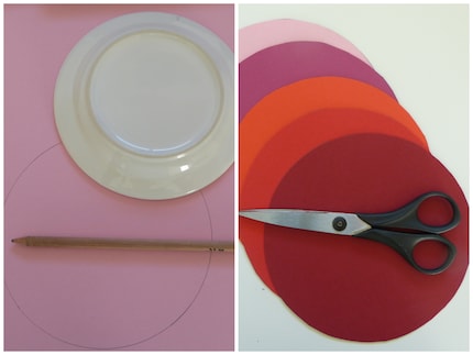 To start, place the smaller plate upside down on the coloured paper and trace it with a pencil. Cut out the resulting circles with the scissors