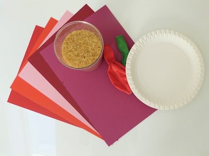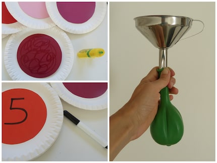 For this fun throwing game, you will need four or five paper plates, at least two balloons, coloured paper, sand or rice and a funnel. Other tools include a small round plate, pencil, scissors, craft glue and a thick black pen. If you prefer something more stable, you can also use plastic or bamboo plates.