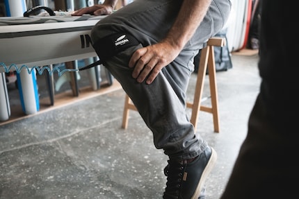Not all board sets come with a leash and some come with a very simple version. You should always be attached to the leash that connects you to the board when you're on the water. "This is very important," says Strobel. "The boards have a volume of over 300 litres and are very light. If you fall overboard in the middle of a lake, you won't be able to get to safety in a strong wind." A spiral leash is recommended, as it can stretch in length like a telephone cord and won't constantly get in your way on the board. "It's best to tie it below your knee so it doesn't get in the way and you can move around easily," advises Strobel. On rivers, the leash is not attached to the leg. The danger of getting caught and dragged underwater is too great. Here there are special quick-release systems that are worn on the hip with a belt.