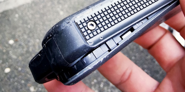 It soon turns out that the outer shell is just a shell. There is a second layer inside the device, which contains the water seal. With other phones, this is an adhesive sticker, but the Nokia 800 features a separate rubber strip. As long as all screws are tightened and the rubber seal isn't torn, the seal is tight.