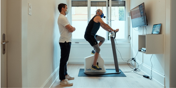 Finally, the bike ergometer is waiting for me. Five minutes of leisurely pedalling, then the resistance increases every few seconds. You pedal until you can do no more. Then you roll out for five minutes and the spiroergometry is complete. This involves measuring your respiratory gases, which provide information about your fitness and recovery status.