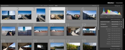 With the multiple image selection, you can also transfer the settings of an already edited photo to others. The image you select first is the image whose settings are transferred to the others. In the screenshot above, this is image number 4, whose background is slightly lighter than the other selected photos. A small plus-minus symbol indicates that this image has already been edited.