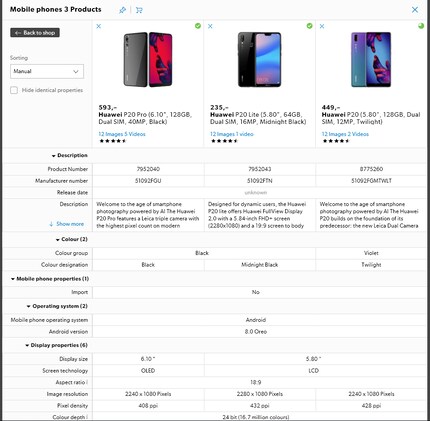 Research tip: You've decided on a manufacturer (e.g. Huawei) but want to understand where the price difference between models comes from (e.g. P20, P20Lite, P20Pro)? Add the models to our product comparison and you'll see an overview of all features that makes it easy to compare devices. This is what our product comparison looks like: