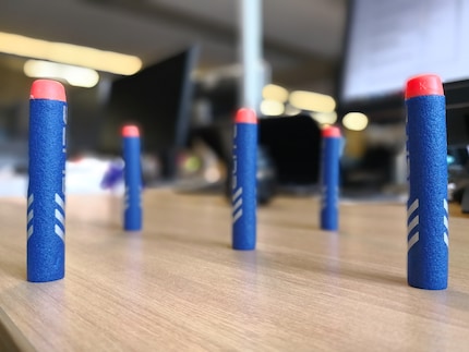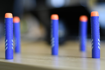 That in turn changes the whole composition. You can see that clearly from my still life of foam Nerf gun shells. From above, they takes on the same shape as the number five on a dice. Here’s what it looks like from the side on a 50 mm camera lens: