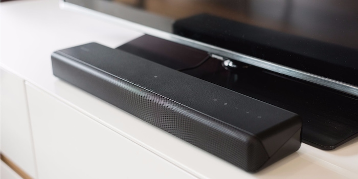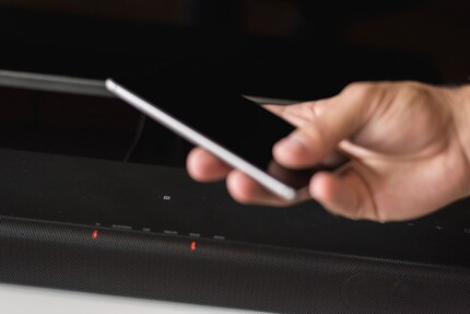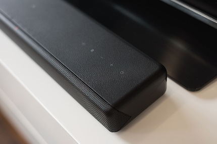 The design is deliberately slim, with minimal LEDs and a leather-like surface. The soundbar, whether in the black or cream-coloured version, blends well and minimalistically into any living room design.