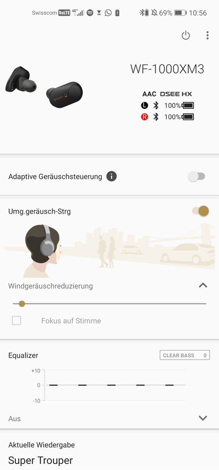 As soon as the rap part starts, I'm surprised at how clearly Eminem and Lil Wayne's voices come across. Despite activating noise cancelling, I never have the feeling that the sound is floating away - as has happened to me with some noise cancelling headphones. With the WF, everything is always clear and powerful. And it's perfectly tuned. That's a joy. The overall sound is very round, the highs don't stand out and the lows don't drop off. I like it.