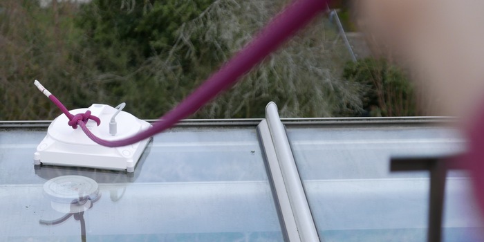 I could just about push the Winbot onto the roof if I stood on my tiptoes. Or abseil down from the roof window. But what if it gets nasty and doesn't want to go any further? Then I'd have to pull the safety line with brute force to get him down again. To start with, I'll tackle the underside of the roof, which is less dirty and easy to reach at its lowest point.