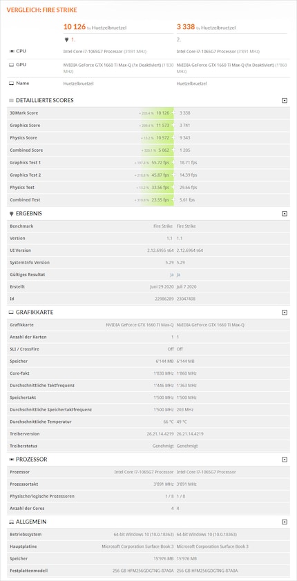 In the picture below you can see two results of a 3DMark benchmark in comparison. It is the identical test that was run at different times with the same device. The first result comes directly from testing after the initial setup of the product. The second was taken immediately after the stress test, which keeps the notebook's hardware at maximum performance until it runs out of battery. Or until the graphics card is fried. Note not only the different score of the two measurements, but also the average memory clock frequency and temperature of the graphics card.