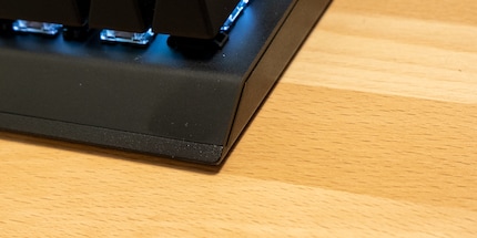 Ergonomically, the keyboard is also excellent. Thanks to the feet that can be folded out in two stages, everyone can find the perfect angle for typing. Standard for keyboards, but still an important feature. The cable guides under the housing ensure less cable clutter on the desk. Finally, the very comfortable palm rest provides the necessary typing comfort. It's great that it's no longer made of artificial leather with a foam lining. I hate that material. I stick to it after a while. That no longer happens to me with the new version. But the palm rest also has a flaw. More on this in the weak points.
