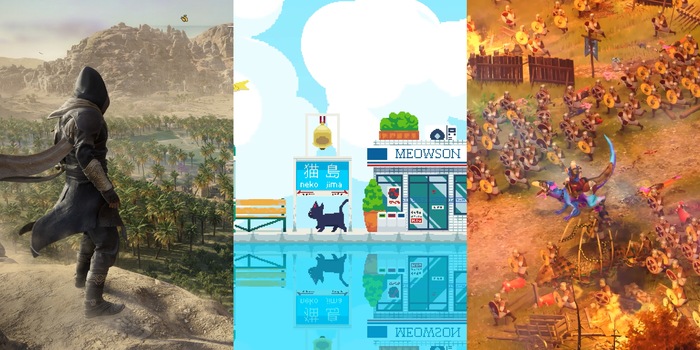 On the Header image, from left to right: «Assassin's Creed Mirage: Valley of Memory», «Cat Isle», «Dino Lords».